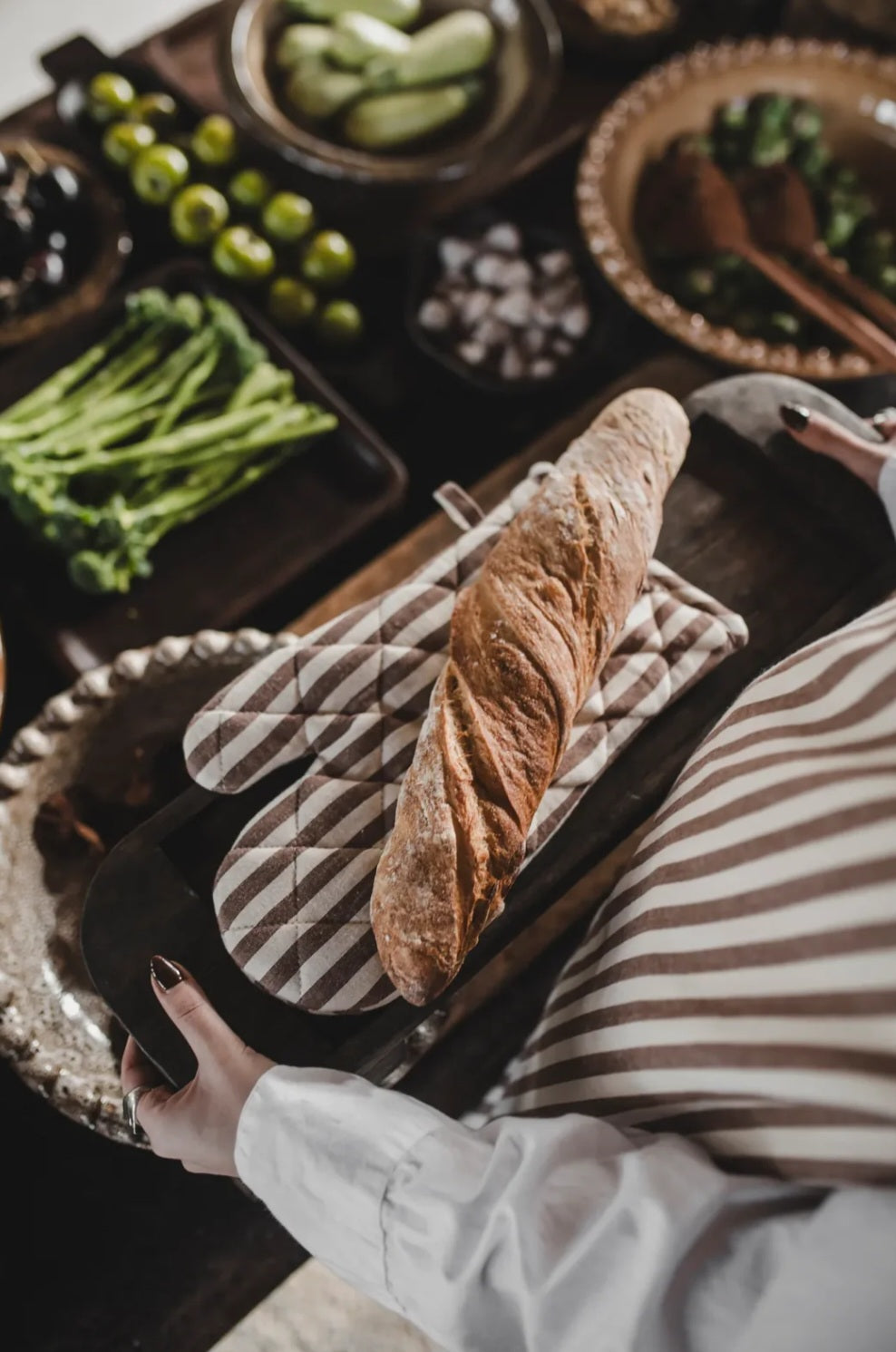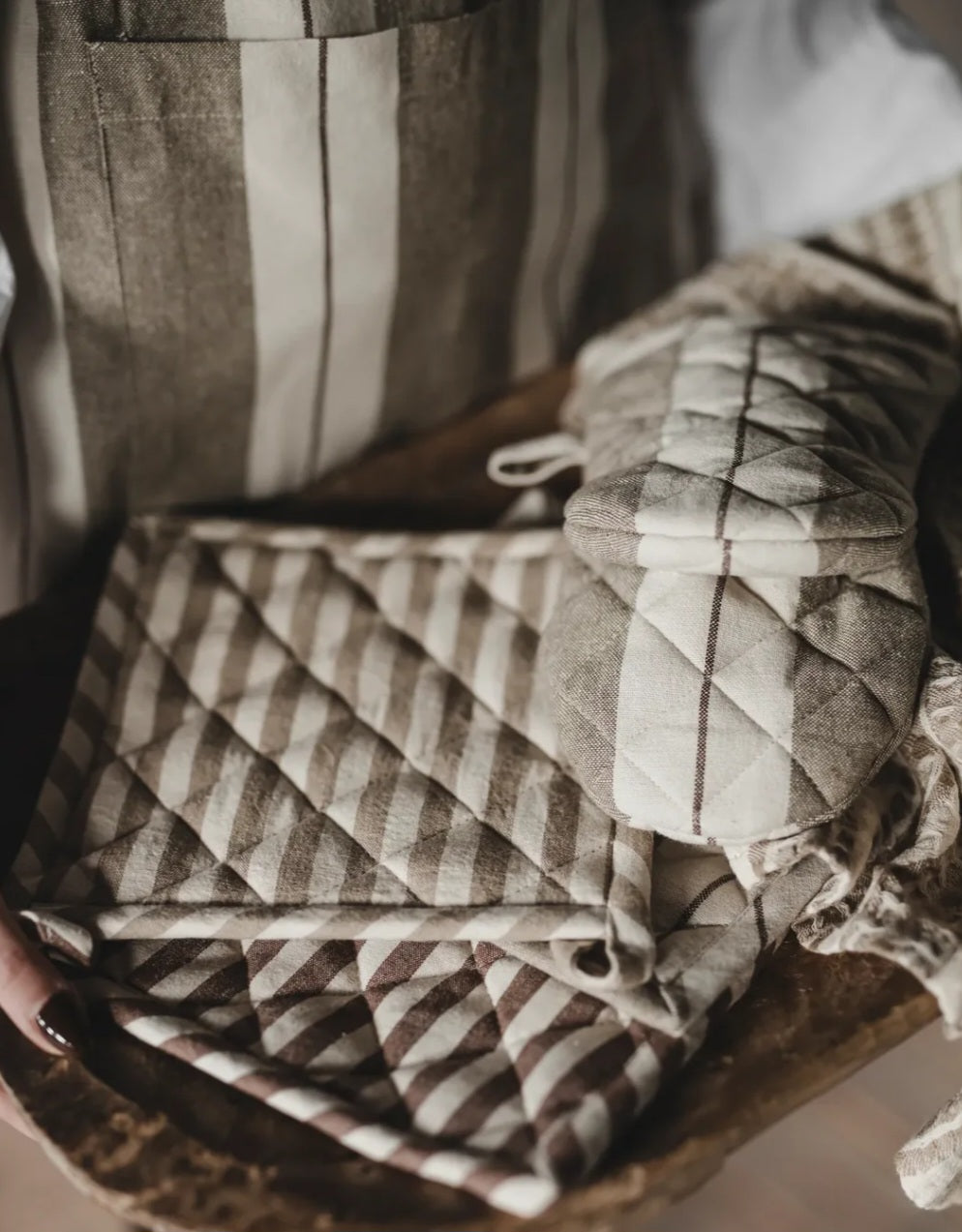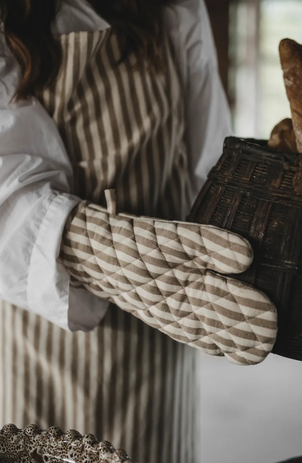 Fine grillhandsker med en tynd beige stribe, som vil bringe friskhed og tidløs følelse ind i køkkenet. Grillhandsken har et bistro udtryk, og er både praktisk og charmerende.