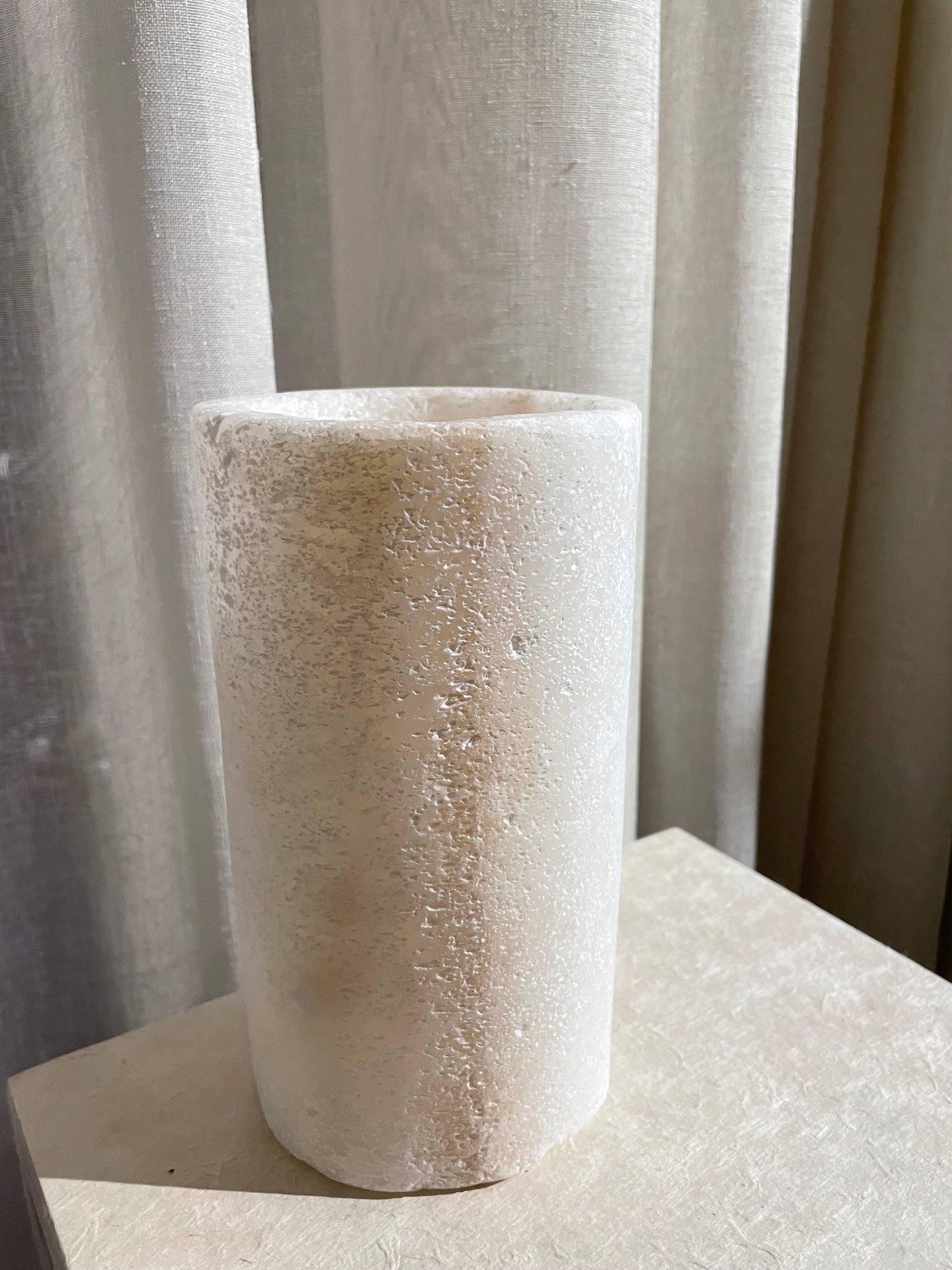 De giver et virkelig smukt skær når man tænder lys i dem! Saltet kommer fra de store saltsøer i oasen og bliver hentet op af de lokale, der efterfølgende bearbejder de store saltblokke. I saltet ses mørke linjer, der er mærker/ fortælling fra store sandstorme i Siwa. Sandet lander i søen og lægger sig som en del af saltblokken – dermed skabes de mørke linjer. Fantastisk smukke og dekorative og med en en helt særlig historie. Det er vigtigt at disse stager ikke kommer i kontakt med vand eller fugt, da de er lavet af salt og dermed kan opløses.