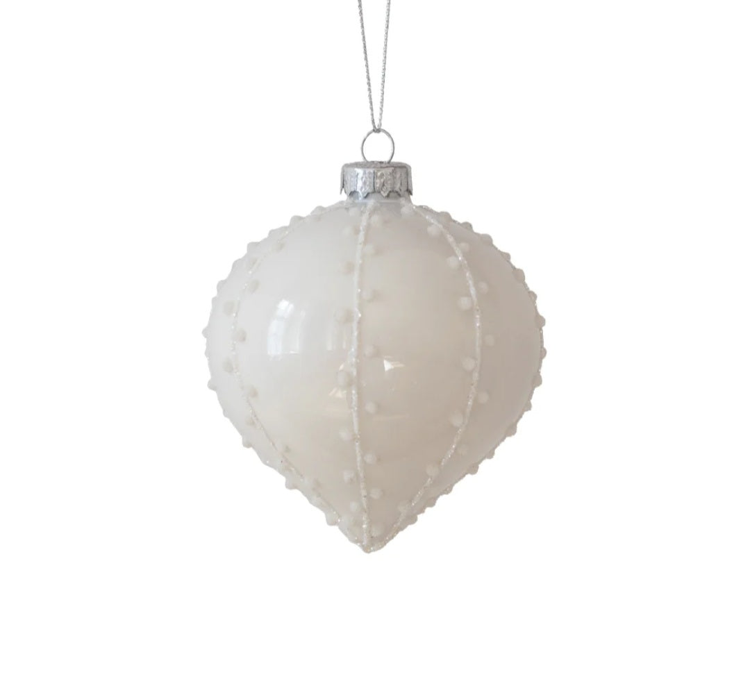 Fin julekugle i hvidt glas med diskrete perler.